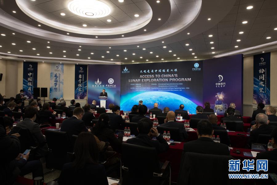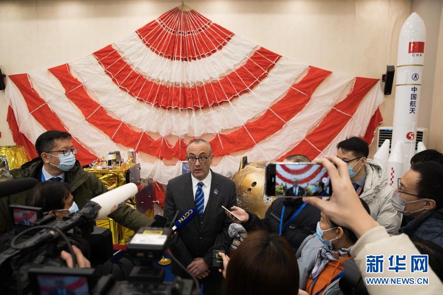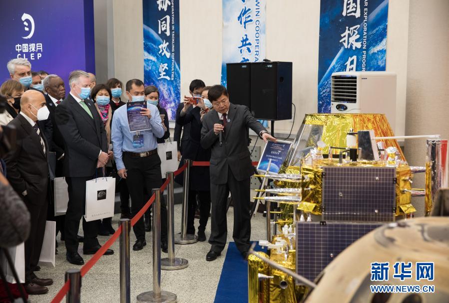 1月18日,外国驻华使馆及国际组织人员在中科院国家天文台听取专家介绍嫦娥五号任务航天器模型和实物。