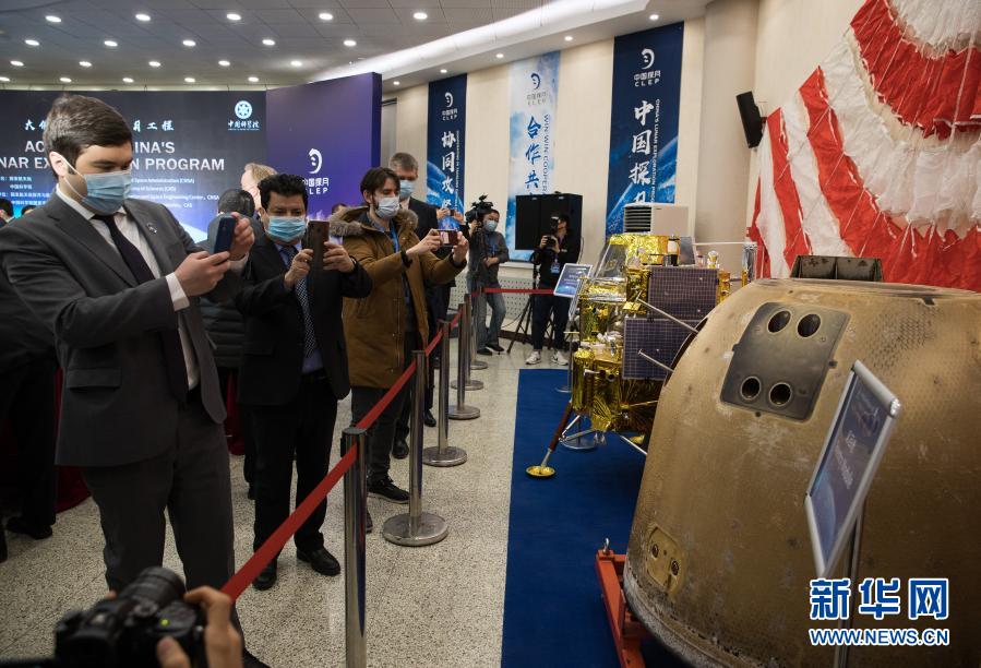 1月18日,外国驻华使馆及国际组织人员在中科院国家天文台参观嫦娥五号任务航天器模型和实物。