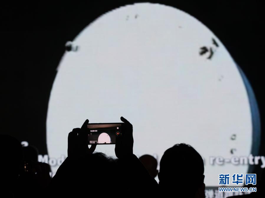 1月18日,在中科院国家天文台,一名与会者在拍摄嫦娥五号任务着陆上升组合体等航天器模型和返回器实物。
