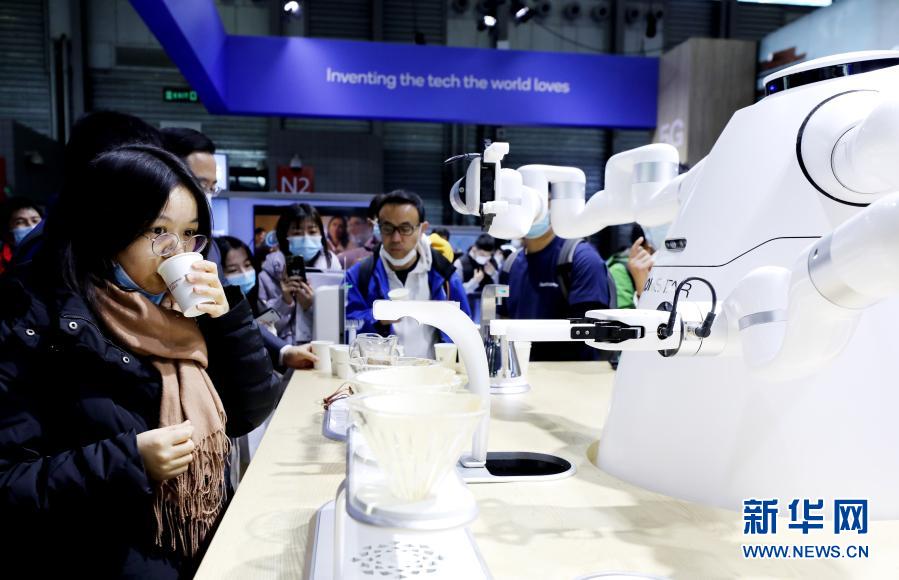 2月23日,参观者在品尝由机器人制作的咖啡。当日,以“和合共生”为主题的2021世界移动通信大会上海展在上海新国际博览中心拉开帷幕。近200家国内外展商集中呈现人工智能、物联网、智能家居等领域的5G创新产品,展现5G在技术创新、应用场景探索、跨界合作和投资方面的发展与实践。新华社记者 方喆 摄