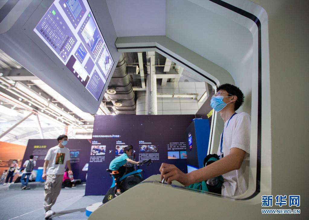 5月22日,参观者在南京科技馆举行的航天科普展上体验“飞行时序操作”。