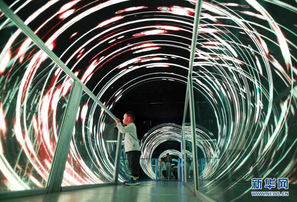 5月22日,小朋友在南京科技馆的“眩光通道”里参观体验。