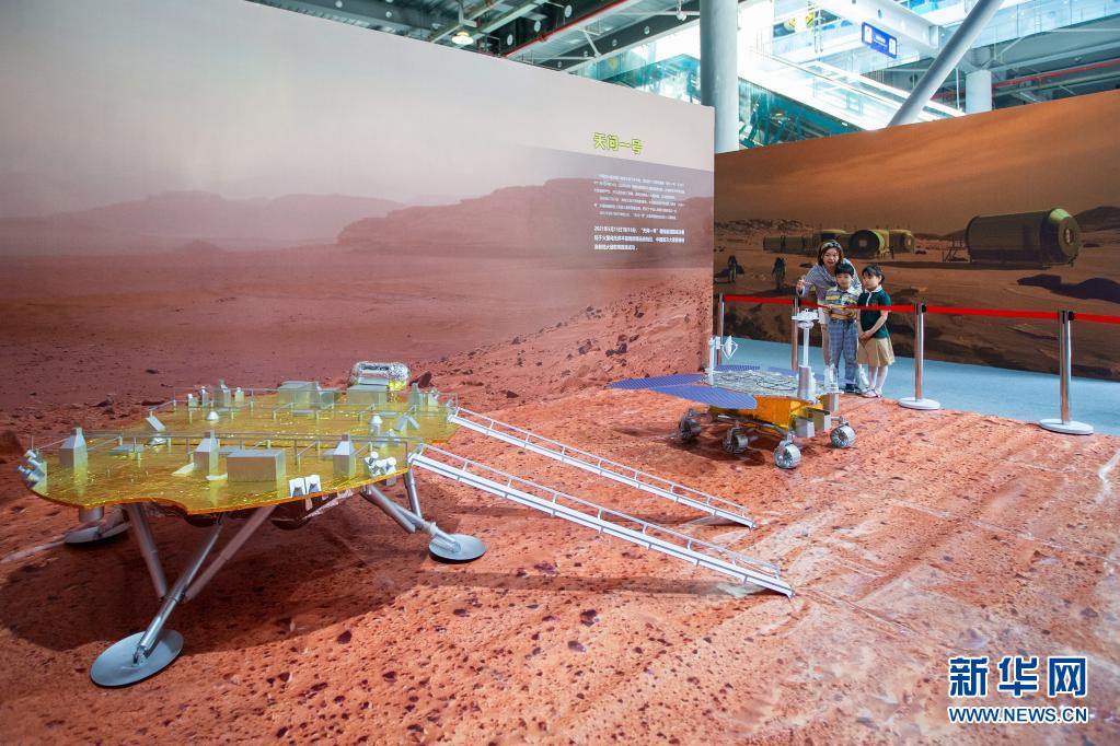 5月22日,家长带着孩子在南京科技馆举行的航天科普展上参观。