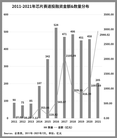 资金正加速涌入芯片赛道。企查查数据显示,近十年我国芯片半导体赛道共发生投融资事件3374件,总投融资金额超八千亿元。其中2021年上半年投融资事件为205起,总金额达2944.02亿元,远超2020年全年的1097.69亿元。