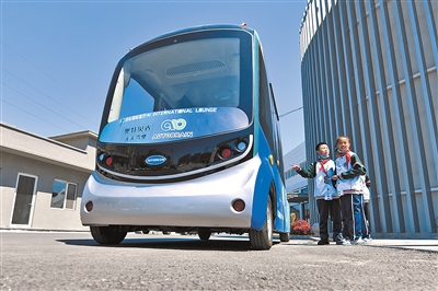 山东省青岛市广饶路小学的学生们体验无人驾驶汽车。
