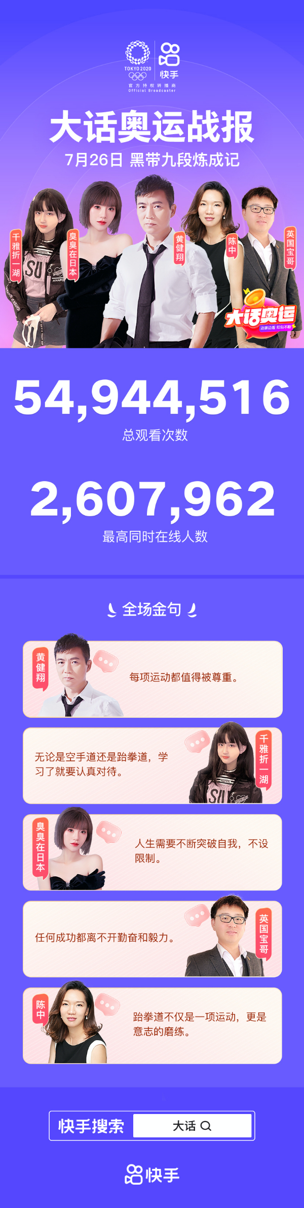 据悉,《大话奥运》是快手推出的奥运特别节目。节目中,快手通过特有“放映厅”功能,邀请专业解说员、运动员、明星和快手达人组成嘉宾团,以直播畅聊的方式,全景式回顾赛事内容,并与用户进行挑战、直播抽奖等互动。