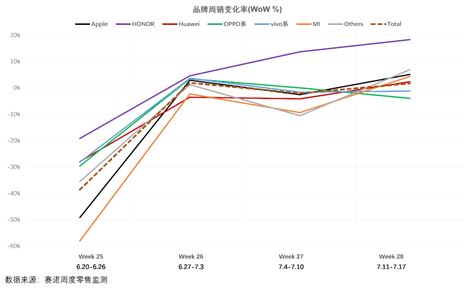 赛诺7月周度市场数据分析显示,第25到28周,荣耀增速明显。第28周,取得接近20%的增长率。尤其是在2500-4000元价位段,荣耀50系列的表现更为抢眼。在此推动下,荣耀品牌连续两周在线上市场的2500-4000元价格段内领先其他品牌,份额达到17.9%。