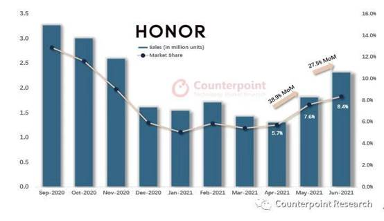 Counterpoint月度智能手机数据显示,荣耀5月和6月分别环比增长39%和27%,同时从市场份额和销量两个角度来看,荣耀智能手机销量已经触底反弹。从7月份的初步数据来看,荣耀市场份额依然维持了增长,整体趋势向全面复苏演进。