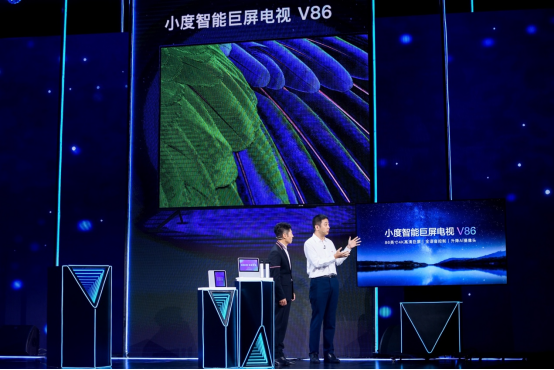 图为景鲲(右一)在百度世界2021发布小度智能巨屏电视