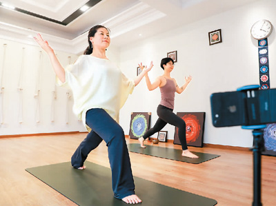 浙江省湖州市德清县武康街道近日邀请瑜伽老师通过手机直播上课,让社区居民们可以在家运动,做到防疫健身两不误。 赵 宁摄(人民图片)