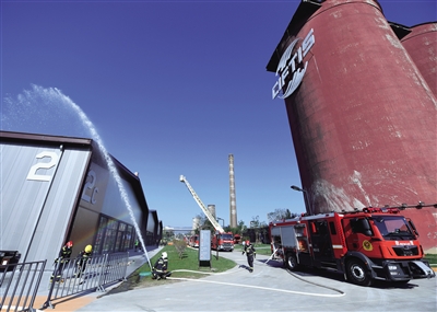 8月21日,消防人员在服贸会展馆开展联合实战演练。今年,服贸会首次使用首钢园区作为专题场馆。新华社记者 张晨霖 摄