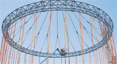 在“国和一号”示范工程某大型模块吊装现场,工人乘坐升降机检查吊具。国家电力投资集团有限公司供图