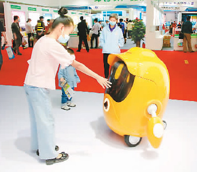 第五届中国-阿拉伯国家博览会近日在宁夏银川举办。图为小朋友在现场与机器人互动。 袁宏彦摄(人民图片)