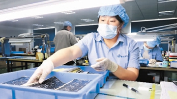 江苏省泗洪经济开发区一车间内,工人正忙着生产一批印刷电子产品。耿怀军摄(人民视觉)