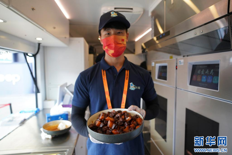 9月3日,工作人员展示智能炒菜机烹饪的食物。 2021年中国国际服务贸易交易会于9月2日至7日在北京举行。在首钢园区会场体育服务专题展区,一台搭载智能厨房的移动餐车吸引了观众的目光。这台智能移动餐车是在新能源汽车基础上升级改造的,智能炒菜机嵌入车体中,配有污水净化装置,炒菜过程无明火、无油烟,实现随炒随吃的便利体验。 新华社记者 荣浩 摄pagebreak