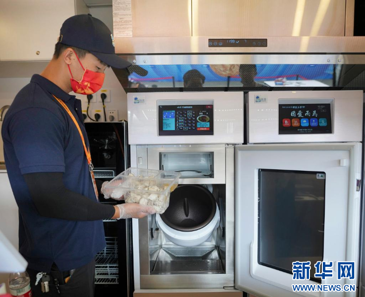 9月3日,工作人员准备将食材放入智能炒菜机。 2021年中国国际服务贸易交易会于9月2日至7日在北京举行。在首钢园区会场体育服务专题展区,一台搭载智能厨房的移动餐车吸引了观众的目光。这台智能移动餐车是在新能源汽车基础上升级改造的,智能炒菜机嵌入车体中,配有污水净化装置,炒菜过程无明火、无油烟,实现随炒随吃的便利体验。 新华社记者 王天聪 摄pagebreak
