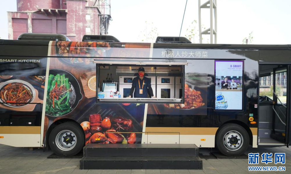 这是9月3日拍摄的智能移动餐车。 2021年中国国际服务贸易交易会于9月2日至7日在北京举行。在首钢园区会场体育服务专题展区,一台搭载智能厨房的移动餐车吸引了观众的目光。这台智能移动餐车是在新能源汽车基础上升级改造的,智能炒菜机嵌入车体中,配有污水净化装置,炒菜过程无明火、无油烟,实现随炒随吃的便利体验。 新华社记者 王天聪 摄pagebreak