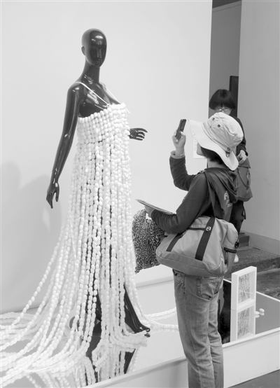 图为曾在上海世博园外南京路步行街虹庙艺术中心亮相、由法国设计师设计的服装。该衣服使用了遇热变色材料,人们一碰它就会自动变色。