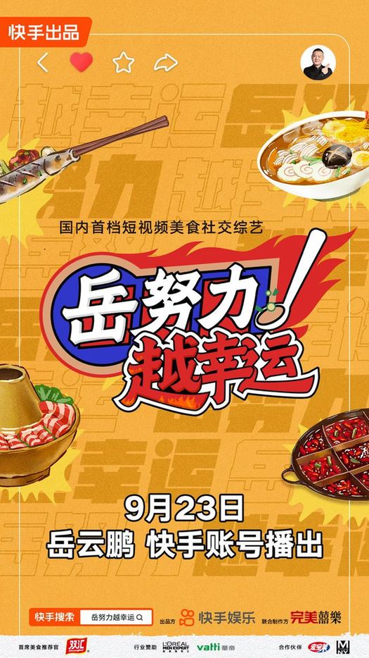快手娱乐首档重点自制综艺《岳努力越幸运》将于9月23日播出,节目中岳云鹏等明星在探寻美食途中,通过社交互动收获了美食、友情、快乐,在完成自我挑战的过程中,也向社会传递了正能量。据悉,该节目独创了“短视频+中视频+直播”的组合播出形态,为综艺行业开创了新的模式。