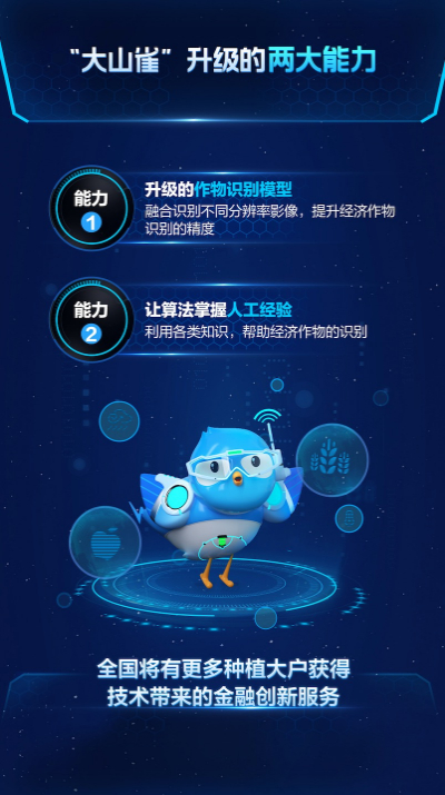 “大山雀”技术通过卫星了解农民种植作物的长势、预判收成,为农民在天上安了一个“信贷员”,实时观测和了解地里种植作物所需资金的时间和规模,实现“天地连接”。