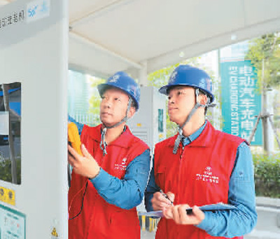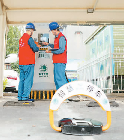 图为滁州供电公司通信技术人员正在对智慧停车充电微应用进行投运测试。
