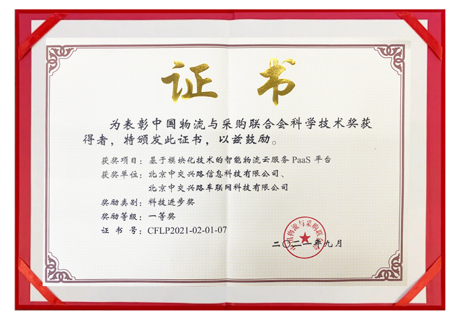 9月27日,第十四届全国现代物流科技创新大会暨2021年度中国物流与采购联合会科学技术奖颁奖大会在北京召开,中交兴路凭借智能物流云服务PaaS 平台收获“科技进步一等奖”。为物流行业的数字化、智能化树立了新的标杆。