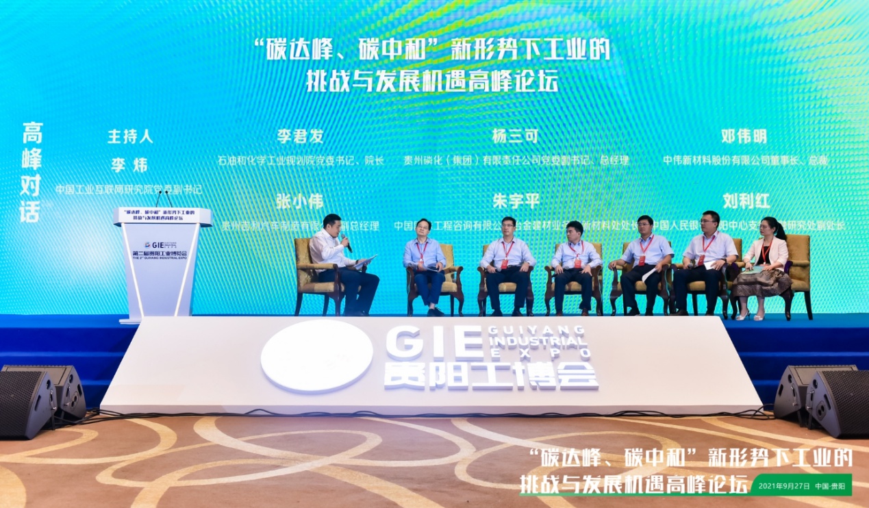 同时本次论坛汇聚石油和化学工业规划院党委书记、院长李君发,贵州磷化(集团)有限责任公司党委副书记、总经理杨三可,中伟新材料股份有限公司董事长、总裁邓伟明,贵州吉利汽车制造有限公司副总经理张小伟,中国国际工程咨询有限公司冶金建材业务部新材料处处长朱宇平,中国人民银行贵阳中心支行金融研究处副处长刘利红等企业领导和行业专家开展高峰对话,围绕新格局新环境下“碳达峰、碳中和”面对的挑战和机遇展开深入探讨,着眼双碳时代背景下,探讨贵州省产业发展新机遇。围绕“碳达峰,碳中和”目标,共同研判工业发展趋势,探讨工业转型升级高质量发展的思路,分享实践经验。