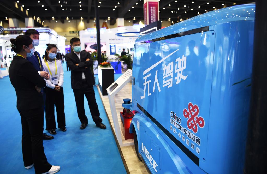 10月10日,观众在北斗融合应用成果博览会上参观一款无人驾驶运输车。 当日,北斗融合应用成果博览会在郑州国际会展中心举行,该展览是在郑州举办的中国北斗应用大会暨中国卫星导航与位置服务第十届年会活动的一部分,展览将持续至12日。 新华社记者 张浩然 摄pagebreak