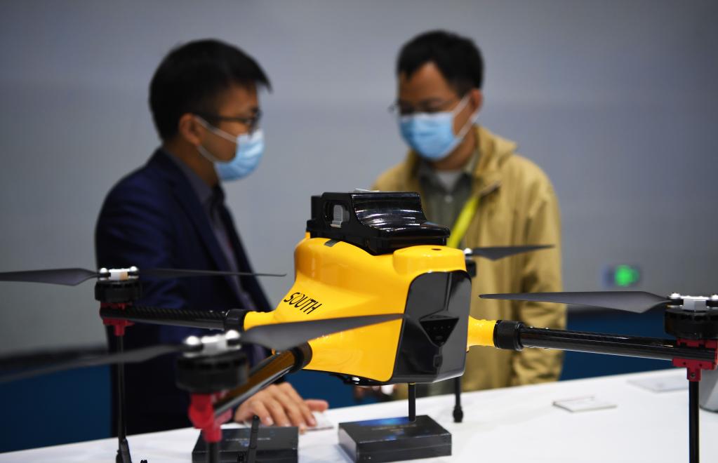 这是10月10日在北斗融合应用成果博览会上拍摄的一款航测无人机。 当日,北斗融合应用成果博览会在郑州国际会展中心举行,该展览是在郑州举办的中国北斗应用大会暨中国卫星导航与位置服务第十届年会活动的一部分,展览将持续至12日。 新华社记者 张浩然 摄pagebreak