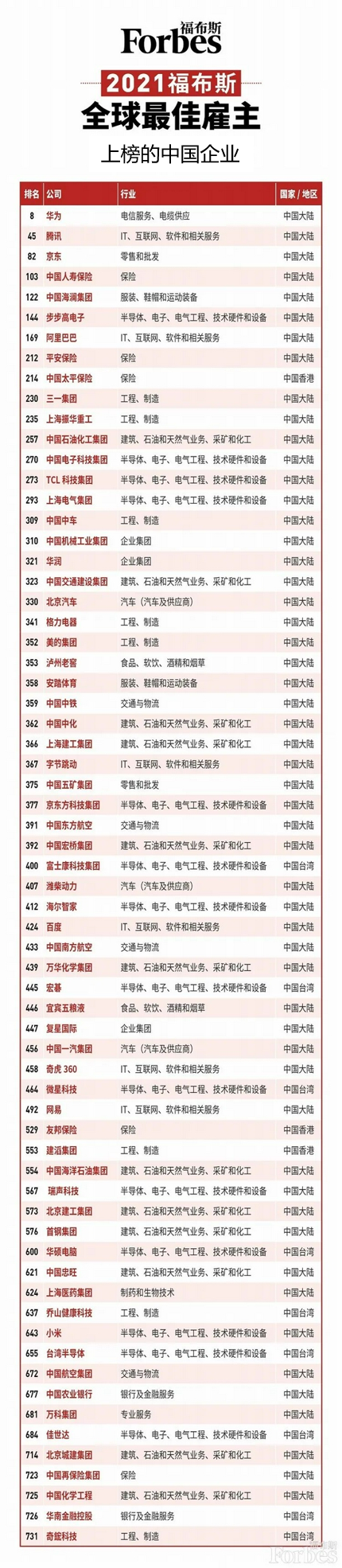 10月13日,福布斯2021全球最佳雇主榜出炉,榜单旨在挖掘并聚焦2021年度标杆企,其中,华为、腾讯和京东位列中国企业前三。榜单来源于对全球受访者的调研,上榜的中国企业展现了全球对中国企业雇主品牌建设、人才发展路径、社会责任等各方面的高度认可。
