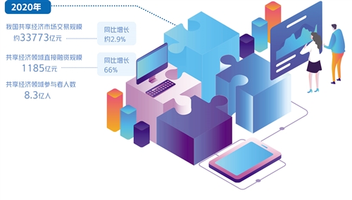 当前,我国共享经济移动化、平台化支撑基础日益完善。数据显示,2020年我国共享经济市场交易规模约为33773亿元,同比增长约2.9%;共享经济领域直接融资规模为1185亿元,同比大幅增长66%;2020年共享经济参与者人数达8.3亿人。