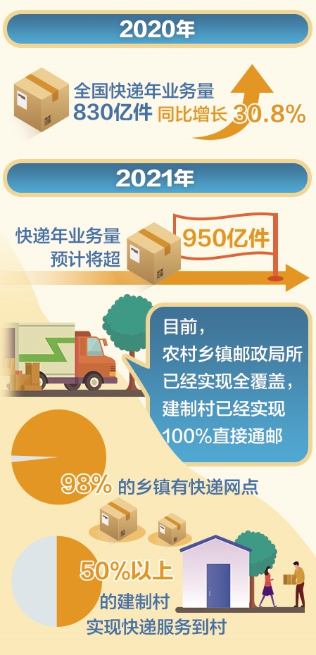 当前,快递年业务量以每年递增100亿件的速度持续高速增长。据国家邮政局预测,2021年快递年业务量将超950亿件。