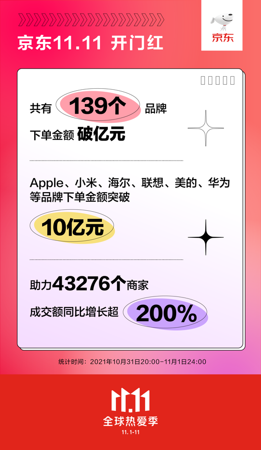 京东11.11开门红再次创造新纪录,截至11月1日24点,139个品牌下单金额破亿元,其中Apple、小米、海尔、联想、美的、华为等品牌下单金额突破10亿元;43276个商家成交额同比增长超200%。