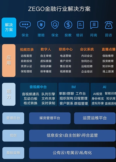 在金融产业中,移动支付、互联网银行、大数据风控都需要让资金精准地在需求者 与供给者之间流动,无论是银行、证券还是保险均对安全与合规有着极度严苛的要求。ZEGO即构科技产互中心以私有化部署的方式为基础,结合公有云加速的先进性,已经为中国银行、海通证券、国金证券、太平洋保险、大地保险等一众客户打造了符合其特点的行业化解决方案。