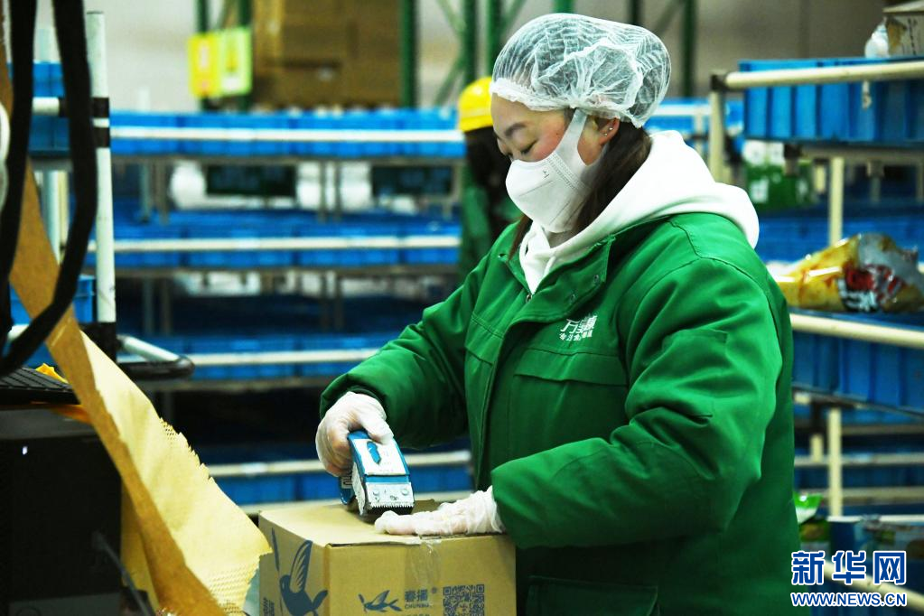 11月11日,在北京市平谷区马坊物流基地的一家电商平台仓库,工作人员将商品进行包装。 为应对“双十一”物流高峰,位于北京市平谷区的马坊物流基地增加人力投入,24小时运营,工作人员加紧将各类商品分拣、装车、配送。 新华社记者 任超 摄