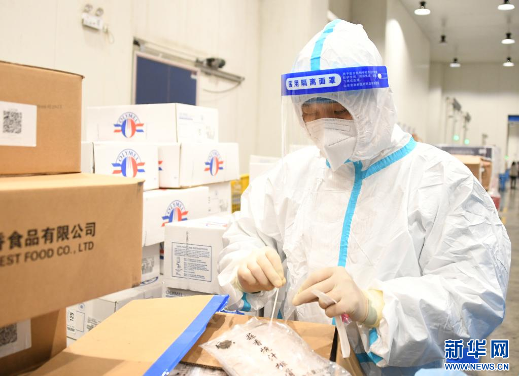 11月11日,在位于北京市平谷区的马坊物流基地冷库,工作人员为冷链商品进行核酸采样。 为应对“双十一”物流高峰,位于北京市平谷区的马坊物流基地增加人力投入,24小时运营,工作人员加紧将各类商品分拣、装车、配送。 新华社记者 任超 摄