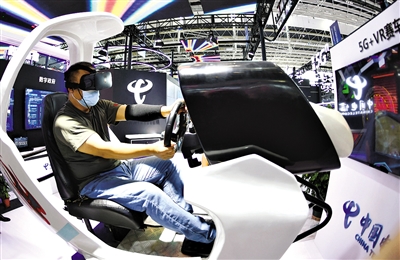 2021数博会上,参观者体验中国电信5G+VR赛车。记者 王晓 摄