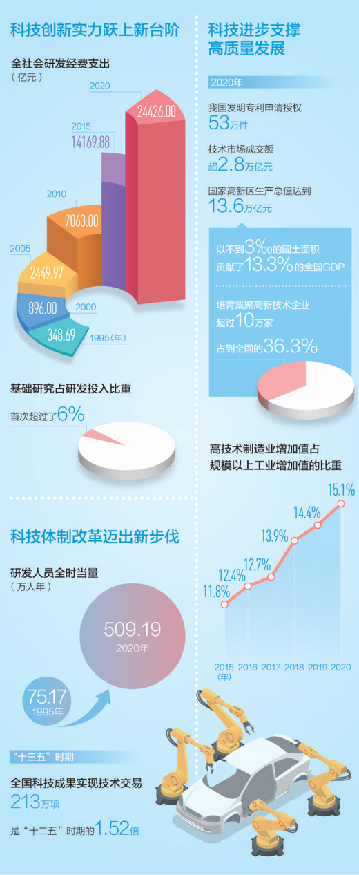 全社会研发经费支出从1995年的348.69亿元增长到2020年的2.44万亿元,研发人员全时当量从1995年的75.17万人年增长到2020年的509.19万人年……一组组数据,展现了我国科技事业取得的历史性成就、发生的历史性变革。
