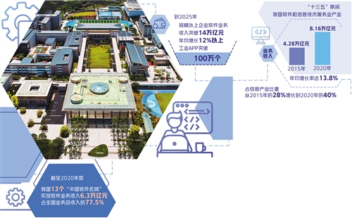 数据显示,“十三五”期间,我国软件和信息技术服务业产业规模效益快速增长,业务收入从2015年的4.28万亿元增长至2020年的8.16万亿元,年均增长率达13.8%,占信息产业比重从2015年的28%增长到2020年的40%。软件加快赋能制造业转型升级,软件信息服务消费在信息消费中占比超过50%。