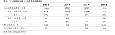 华创证券分析,5G消息市场机会巨大,从5G消息的“近景”看,有望将传统短信的400亿元市场空间提升到千亿元左右规模。从“远景”看,未来5至7年结合云、大数据、AI等新型技术,5G消息的市场规模有望达到3000亿元。浙商证券称,未来行业客户将贡献5G消息的主要市场规模,2025年将达到580亿元。