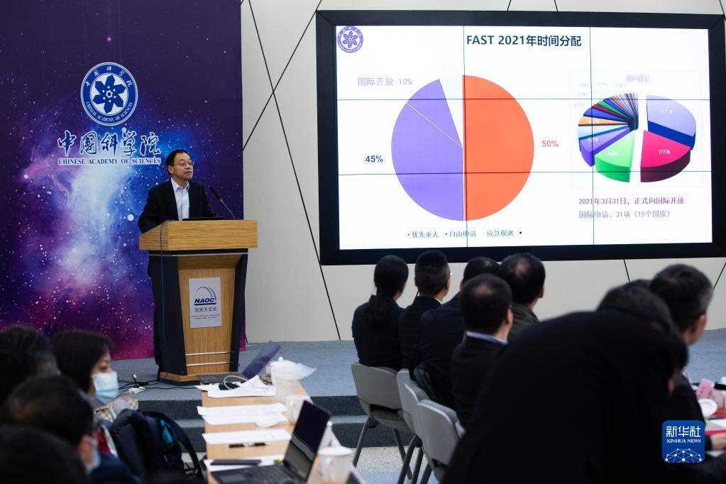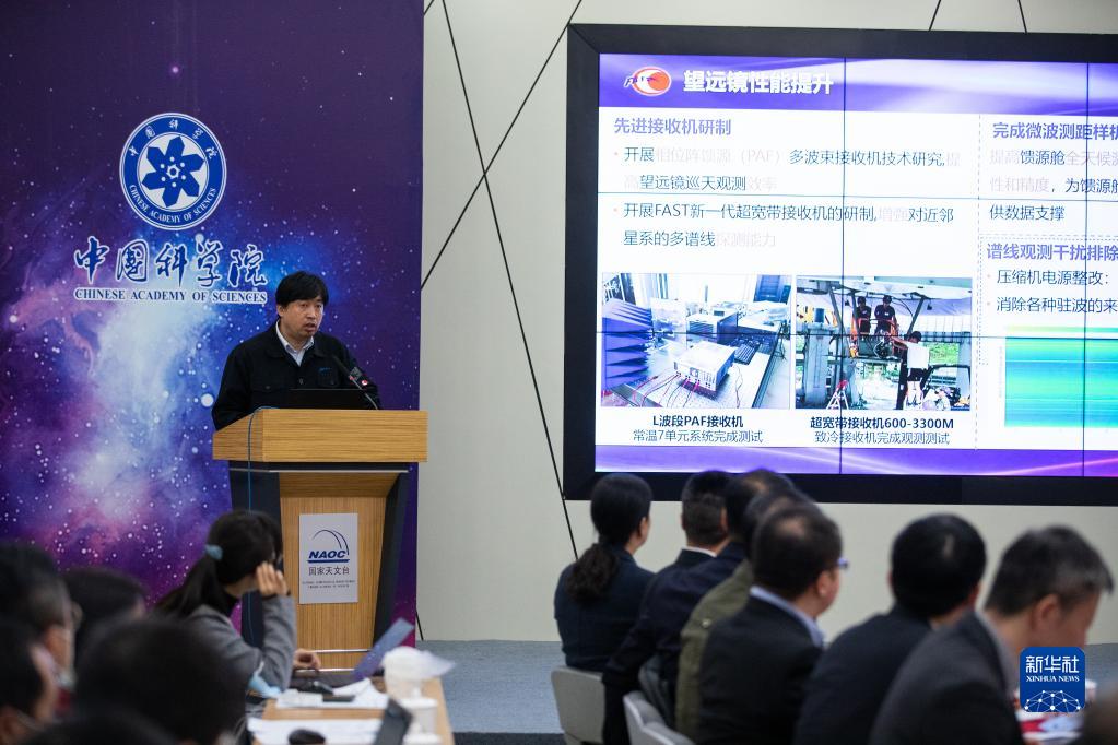 1月5日,在中科院国家天文台举行的新闻发布会上,FAST运行和发展中心常务副主任、总工程师姜鹏在介绍FAST运行及开放共享情况。新华社记者 金立旺 摄