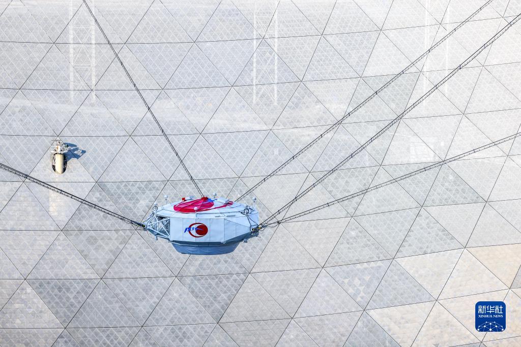 2021年12月17日,工作人员对“中国天眼”的馈源舱进行维护保养。新华社记者 欧东衢 摄