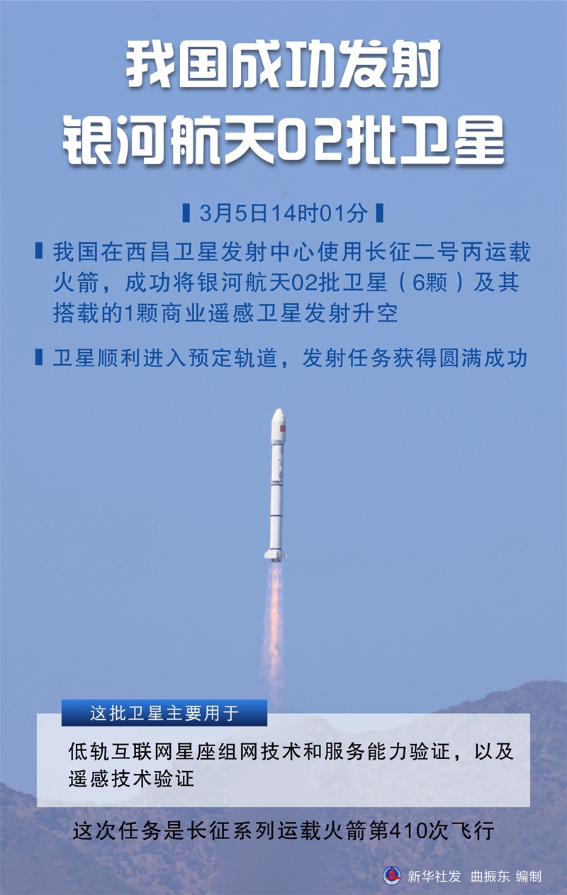 3月5日14时01分,我国在西昌卫星发射中心使用长征二号丙运载火箭,成功将银河航天02批卫星(6颗)及其搭载的1颗商业遥感卫星发射升空。卫星顺利进入预定轨道,发射任务获得圆满成功。新华社发(郑仲利 摄)