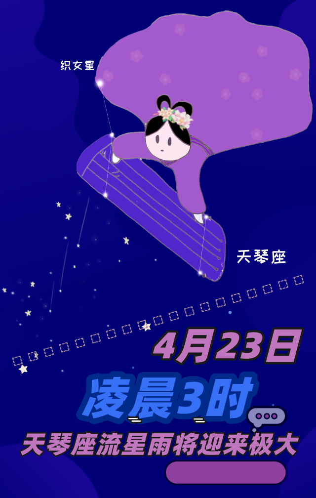 天文预报显示,今年的天琴座流星雨将于4月23日凌晨3时迎来极大。“该流星雨的辐射点距离天琴座中最亮的恒星和夜空中第五亮的恒星——织女星不远,可以利用织女星快速定位辐射点的大致位置。北半球中纬度地区,辐射点天黑后不久就会升上地平线,整夜可以观测,黎明前辐射点几乎到达头顶,对北半球观测者十分有利。但随着辐射点升高,升起的下弦月会对下半夜的目视造成极大的影响。”宋媛媛说。