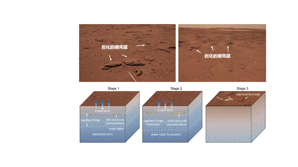 研究团队推断,这些硬壳层可能是由地下水涌溢或者毛细作用蒸发结晶出的盐类矿物,胶结了火星土壤后经岩化作用形成。