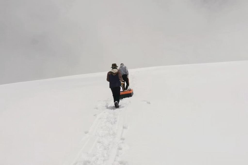 科考人员拉着冰川雷达测厚仪开展测量工作。(受访者供图)