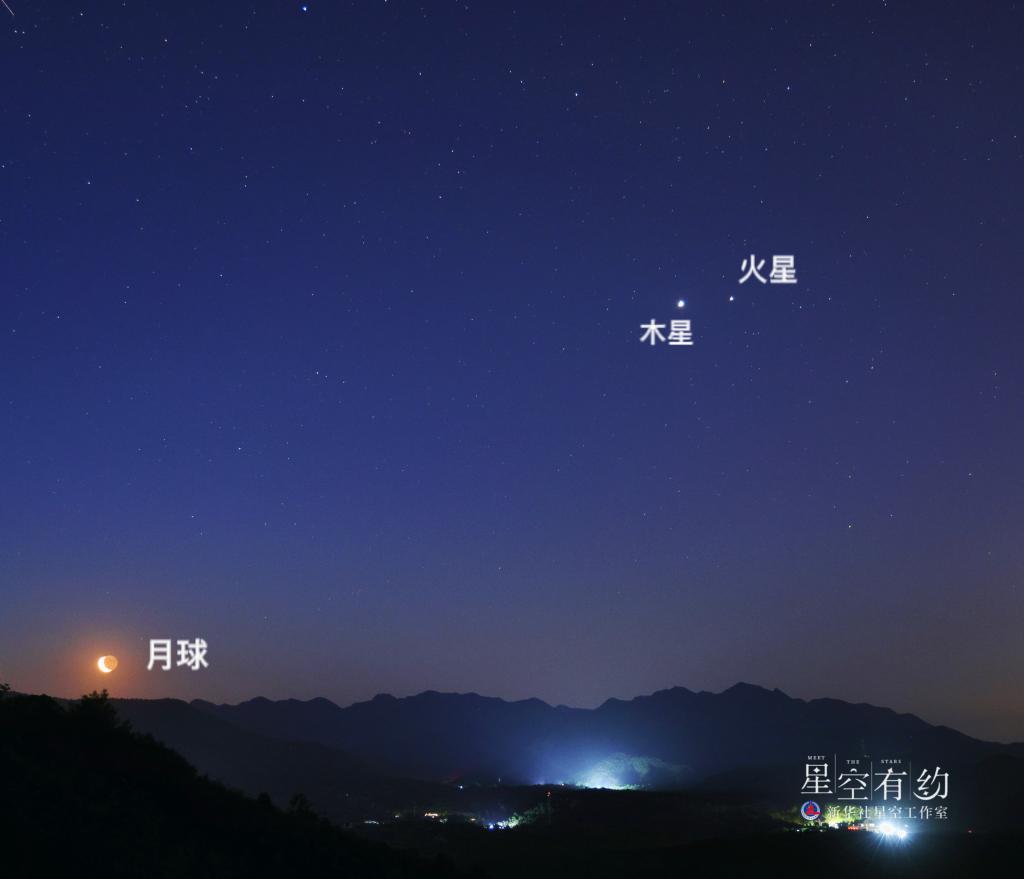 这是天津市天文爱好者赵中天2022年5月27日凌晨在天津蓟州罗庄子镇拍摄的火星、木星和月亮。(本人供图)