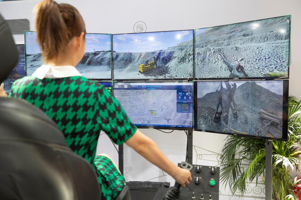 2022世界5G大会展厅内,参观者体验5G网络支持下的远程挖矿设备。新华社记者 张涛 摄