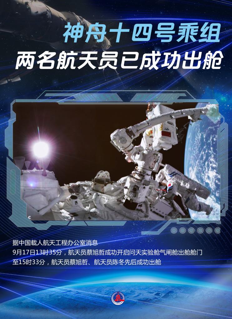 新华社北京9月17日电(李国利、杨欣)据中国载人航天工程办公室消息,9月17日17时47分,经过约5小时的出舱活动,神舟十四号航天员陈冬、刘洋、蔡旭哲密切协同,完成出舱活动期间全部既定任务,航天员陈冬、航天员蔡旭哲已安全返回问天实验舱,出舱活动取得圆满成功。