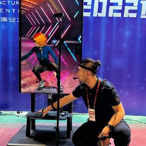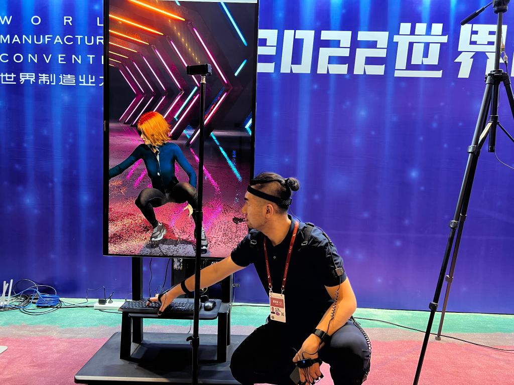 穿着轻便的装备,自如地下蹲、转身、舞动双手……一台大屏幕前,合肥孪生宇宙科技有限公司创始人王子淼正在和屏幕里的虚拟人精准“同步”。这家成立不到一年的初创企业将自主研发的孪宇一键虚拟人直播设备带到了2022世界制造业大会现场。